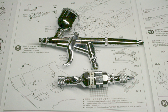 サーフェーサーの話題に入る前に、少しだけ私の愛用ツールを紹介させてください。 上の写真に写っているハンドピースは、私がエアブラシ塗装を始めた頃から使っている「タミヤHG シングルエアーブラシ0.3㎜」です。 実は、購入したのは約20年前。当時の手頃な価格と、シンプルな構造で扱いやすかったことから手に取りました。