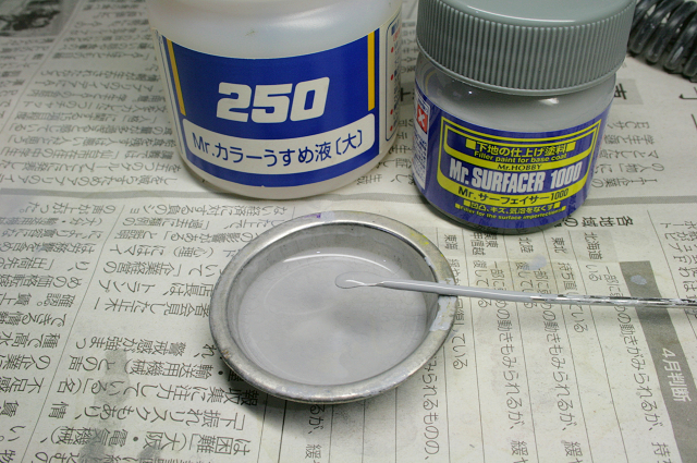 次に、いよいよサーフェーサーを吹き付けていきますが、ここでモデラー永遠の課題、塗料の希釈です。 私の場合は、Mr.カラー薄め液を使用し、塗料皿に原液を調色スティックで数回に分けて取り、その分量と同等もしくは若干多めの薄め液を加えて希釈しています。調色スティックで塗料をすくい、トロミや粘度を確認しながら調整します。 濃すぎるとエアブラシが詰まり薄すぎると塗料がキットに乗らずに弾かれてしまうため、この希釈具合は経験を要します。(いまだに失敗はしょっちゅうですが…)