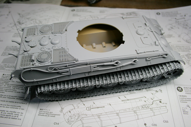 さて、本題に戻ります。サーフェーサー塗布前の事前準備として、塗装後に組み付ける砲塔と車体を分離しておきます。