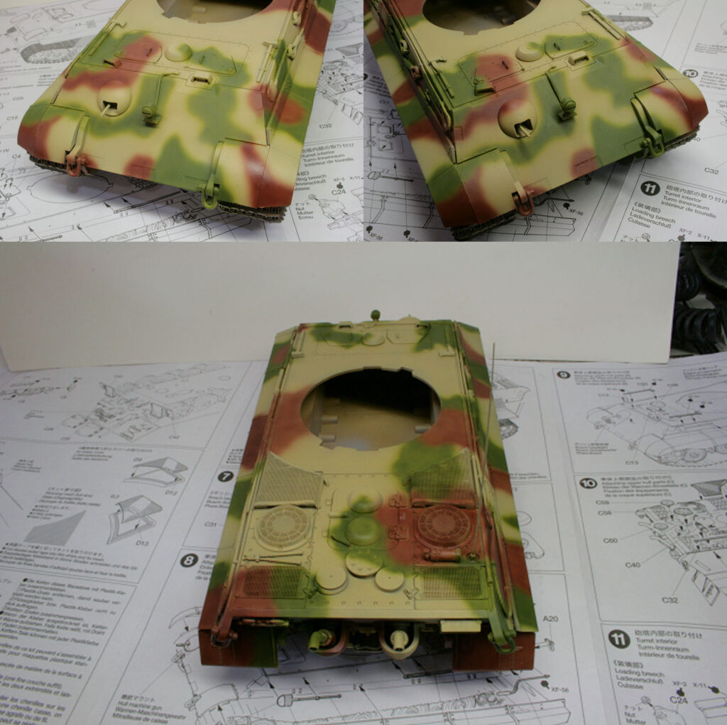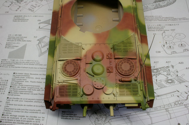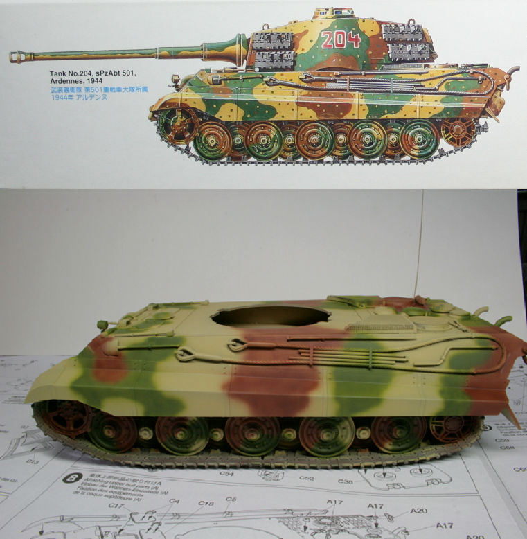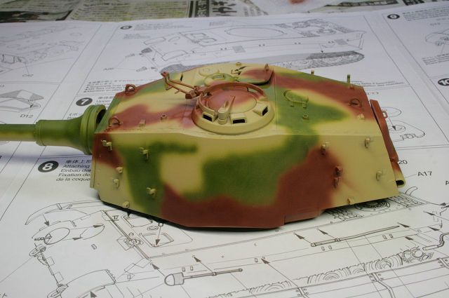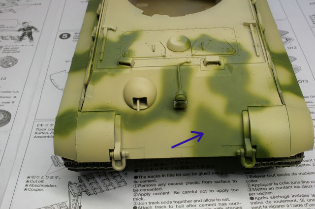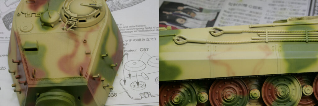 左側面の迷彩ですが、以前触れたとおり説明書と箱絵の迷彩パターンが異なります。最初は箱絵を参考に迷彩を進めていたので、仕方なく左側面の迷彩パターンは箱絵通りとします。