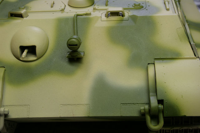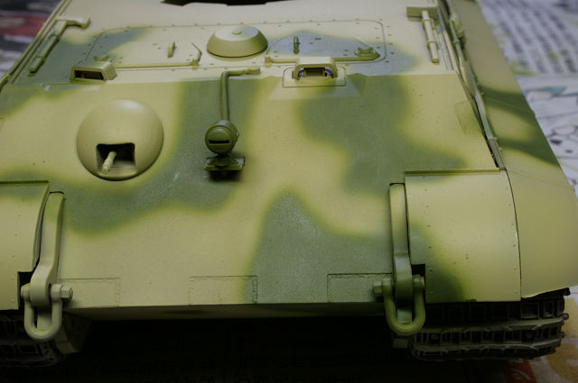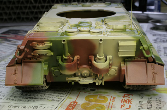 続けて、車体後部や両側面に描いた迷彩パターンの延長として、車体の上面および前面にも迷彩を描いていきます。